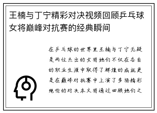 王楠与丁宁精彩对决视频回顾乒乓球女将巅峰对抗赛的经典瞬间